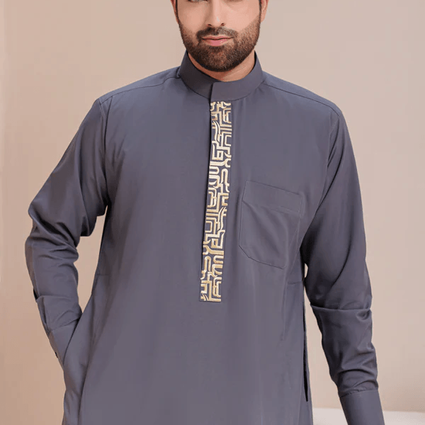 The Grey With Golden Embroidery Thobe combines modern elegance with traditional craftsmanship. Made from soft, breathabl Read More